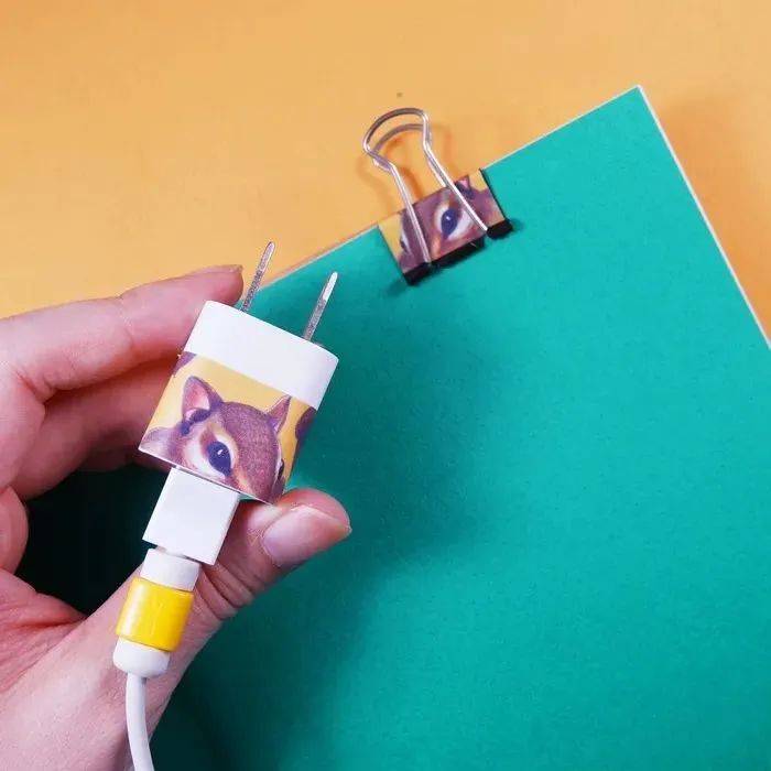 3.装饰长尾夹、手机充电插头:日常生活中,长尾夹是耐用又可以收纳很多纸张的夹子,但很少看到造型好看的,这时候只要把长尾夹的黑块贴上喜欢的纸胶带,单调的它们也可以迅速变成可爱的样子。